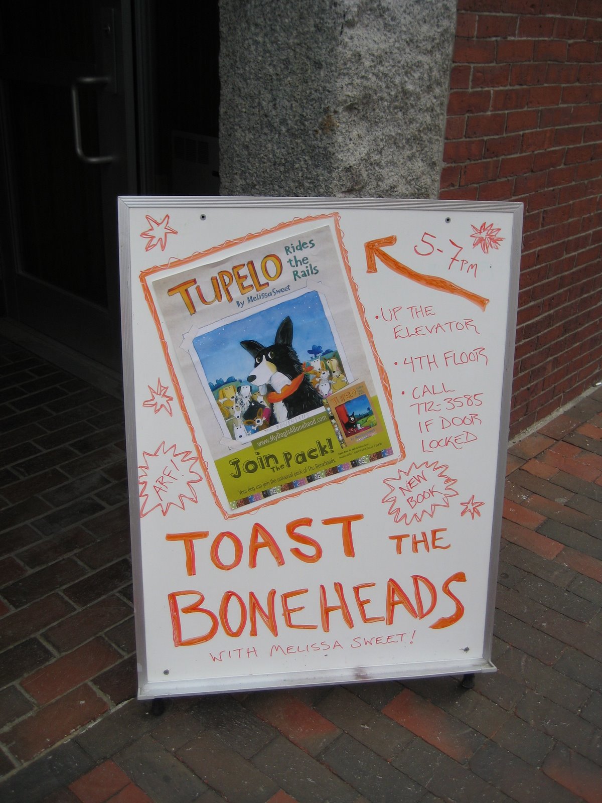 A stupendous group of fellow artists, readers, and other dog lovers showed up to raise their glasses (of dog wine) to TOAST THE BONEHEADS. The BONEHEADS are the stars of Melissa Sweet’s new picture book, Tupelo Rides the Rails.